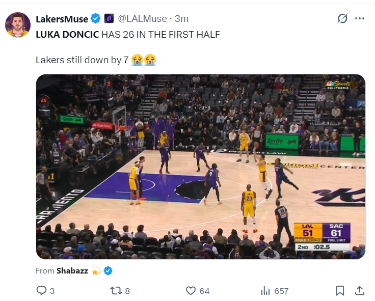太惨烈了,蒙克一人比湖人全替补都要厉害,蒙克10分钟已经拿到15分,而湖人四个替补合计4分,湖人第二节打了一半才拿37分(詹东27分),湖人落后西部倒数第二的国王14分了。东契奇只能各种造犯规稳定战局,蒙克三分5连中全场欢呼,东契奇完成了一个抛投的准压哨三分,单节15分3助攻2篮板帮助湖人迫近比分,半场东契奇14中10拿到26分5助攻3篮板1抢断。
