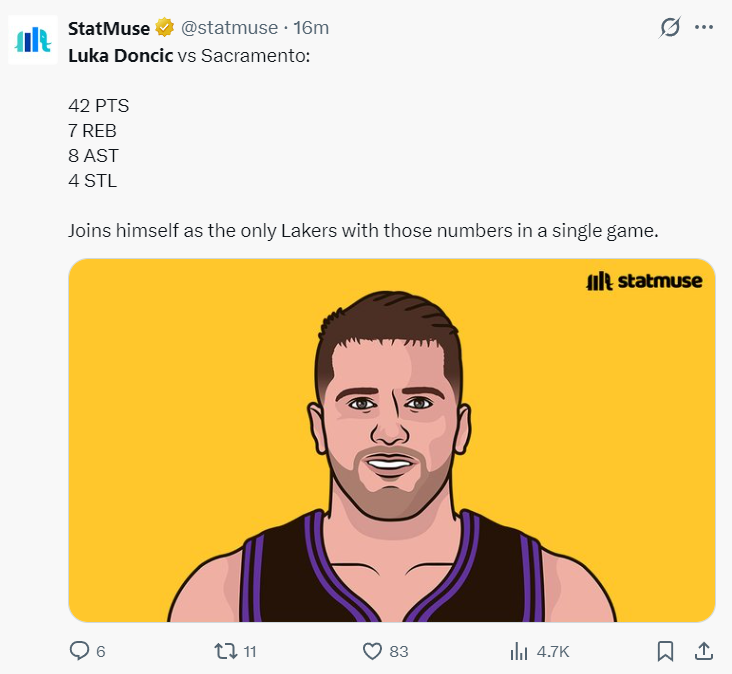 美媒:东契奇是湖人队史第一位单场至少42+8+7+4抢断的数据。